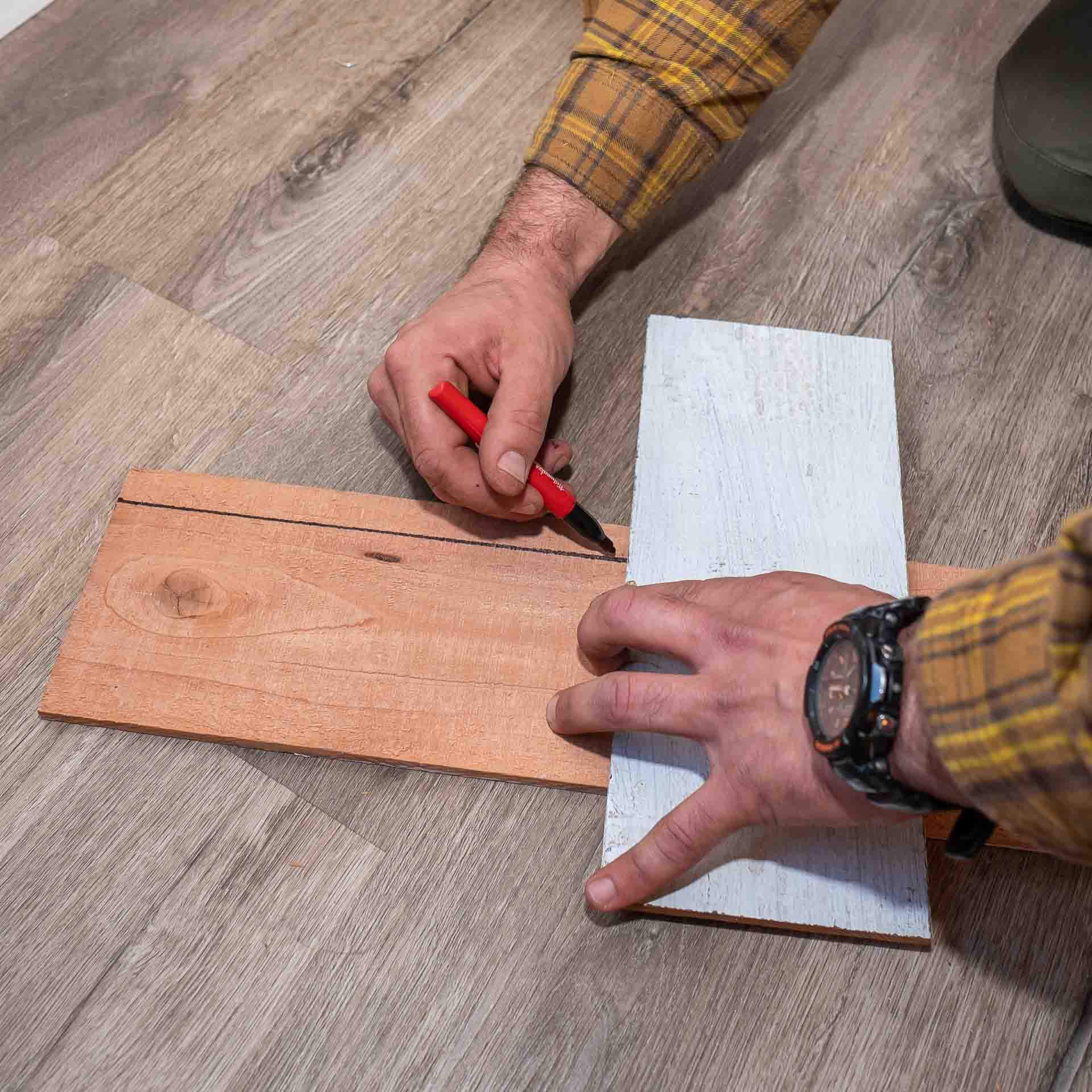 Cut boards to desired lengths. Plan your pattern on the floor to decide how they’ll look on the wall. One method is to start every other row with half boards for efficient staggering. For more rustic pieces, trim uneven ends. Make sure the wall is clean, dry, and smooth. Safety goggles and gloves recommended.