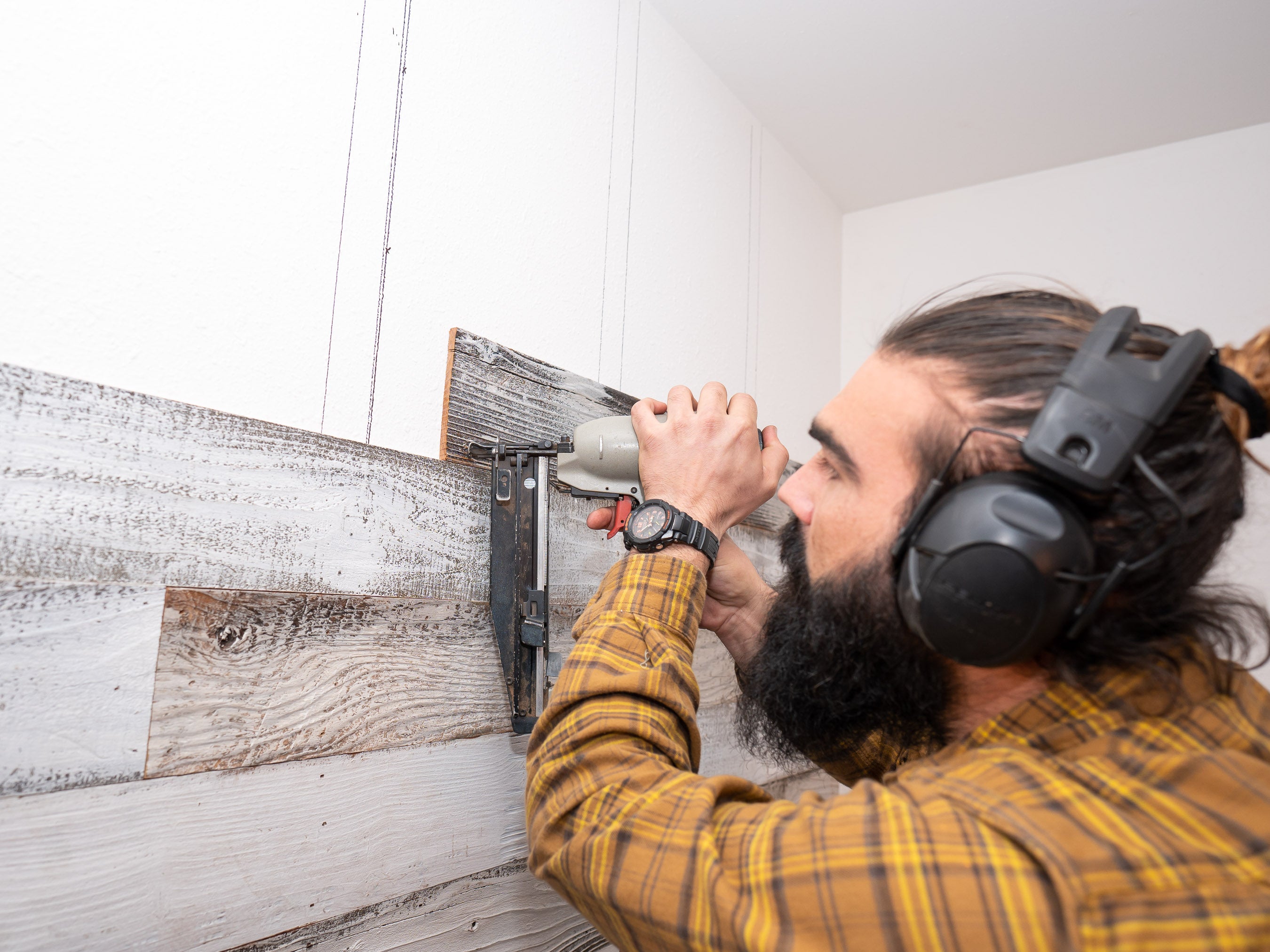 Attach each board with glue and nails, ideally into wall studs. Start from the bottom corner, using a level to keep the first row even. Install row by row, staggering the seams, and leave a 1/8" gap around the edges of the wall for wood expansion. Carefully cut planks to fit around outlets, windows, and doors.